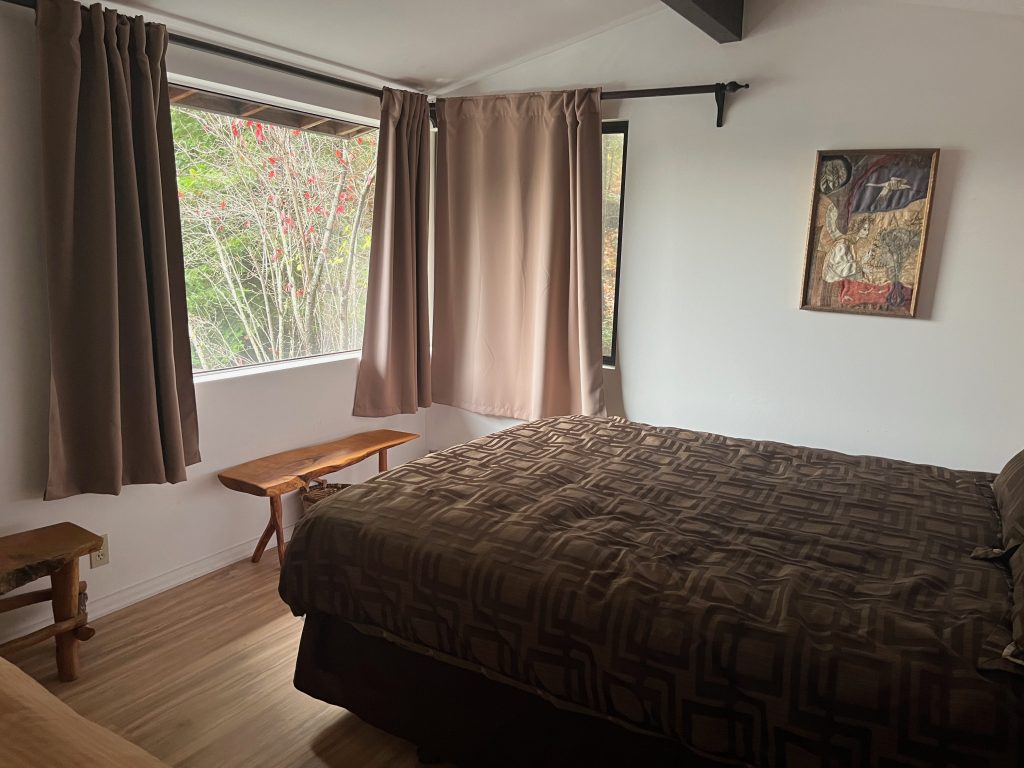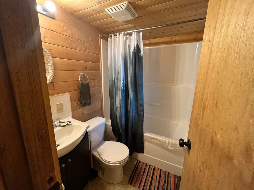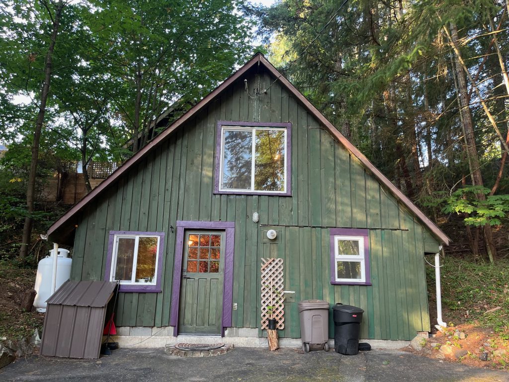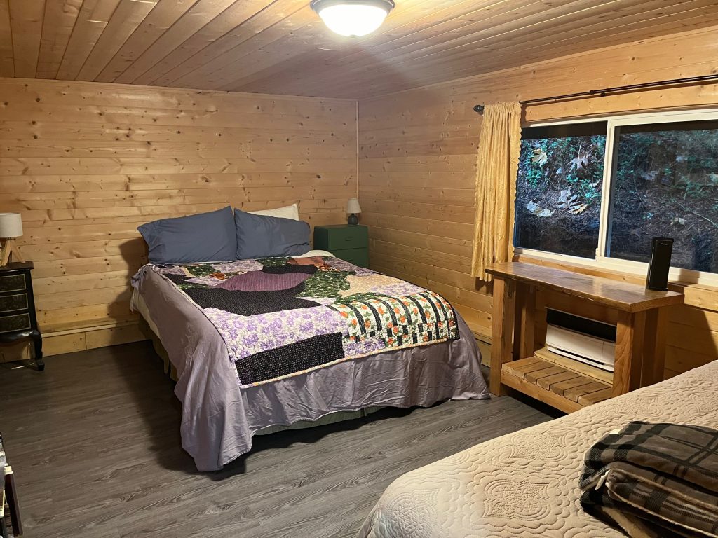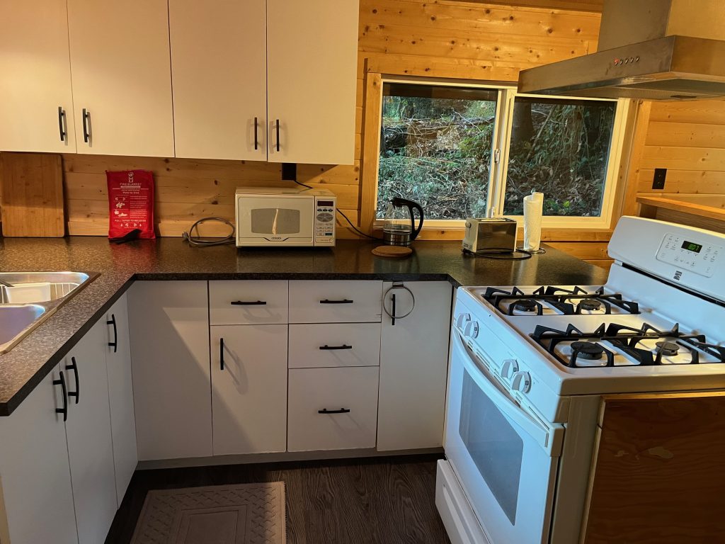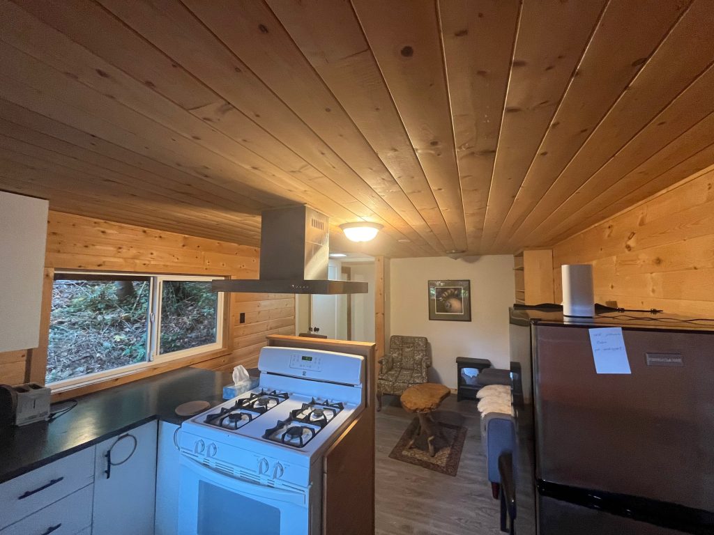 A clean, cozy cabin, spacious enough for two people, ocean glimpses from upstairs window. Full kitchen and bathroom, Wi-Fi, and shared laundry.